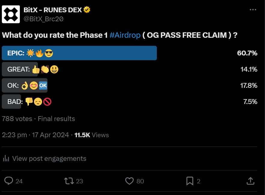 <figure><img src="https://397862436-files.gitbook.io/~/files/v0/b/gitbook-x-prod.appspot.com/o/spaces%2FxXtG9N8vg0yYKtFnYUNK%2Fuploads%2FWTllflzLsaFqe6WbC9Uw%2Fimage.png?alt=media&#x26;token=466af78f-544e-4b20-b8f3-c3909723747b" alt=""><figcaption><p><a href="https://twitter.com/BitX_Brc20/status/1780572731357925597">https://twitter.com/BitX_Brc20/status/1780572731357925597</a></p></figcaption></figure>